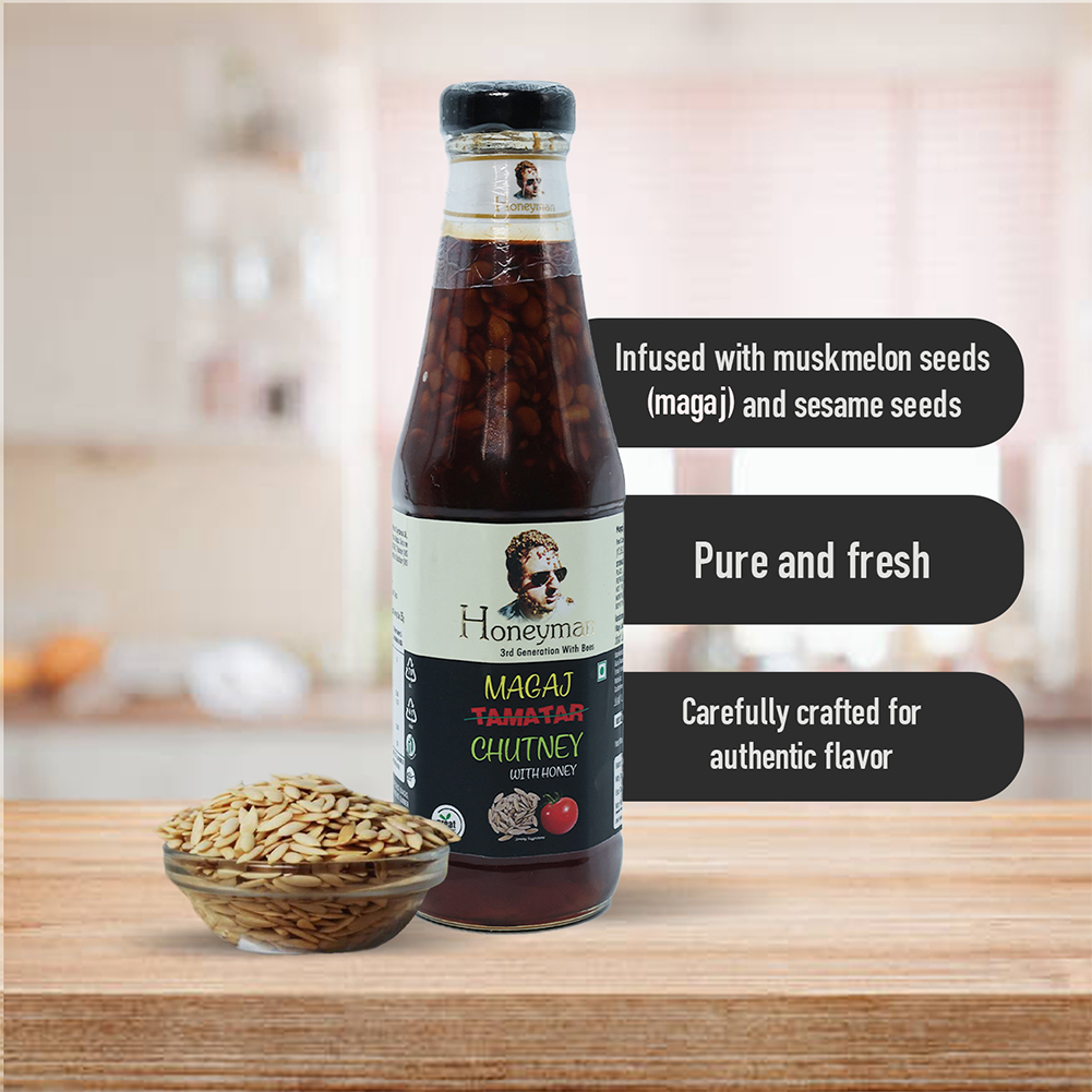 Complementing it is the Honey Magaj Tamatar Chutney, a luxurious blend of ripe tomatoes, wholesome magaj (melon seeds), and golden honey. With its creamy texture and nutty undertones, this chutney brings a delightful twist to parathas, sandwiches, or as a unique dip for appetizers.