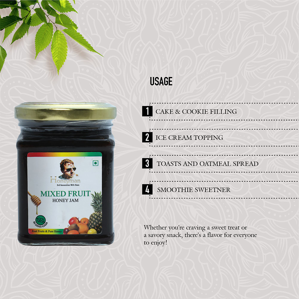 Enjoy it at breakfast or as a snack – spread it on toast, mix it in yogurt, pair it with parathas, or use it as a topping for pancakes and desserts. A jar of our Mix Fruit Honey Jam brings the best of taste and health together.