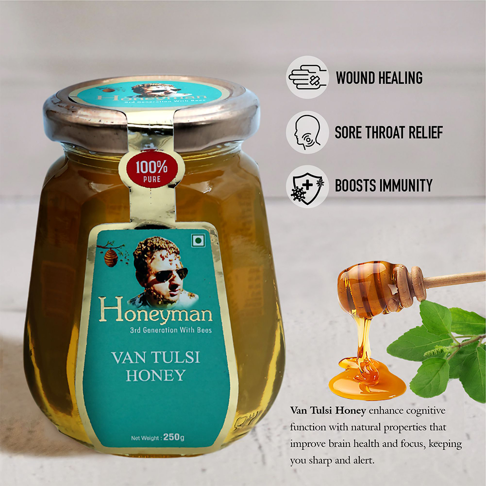 A divine fusion of health and taste, Honeyman’s Van Tulsi Honey is collected from the nectar of wild tulsi (holy basil) flowers. Revered in Ayurveda as a sacred herb, tulsi carries powerful healing properties that get infused naturally into this honey. The result is a fragrant, slightly herbal honey with immense therapeutic benefits.